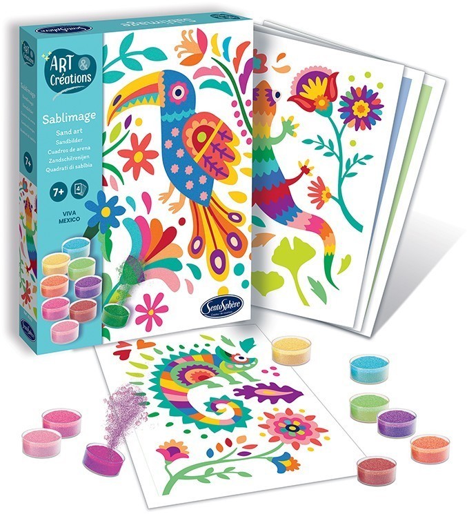 Met de Art & Creations Sablimage Set Viva Mexico knutselset kunnen kinderen en volwassenen kleurrijke zandkunstwerken maken met vrolijke Viva Mexico-thema’s. Door de zelfklevende sjablonen vrij te maken en het meegeleverde gekleurde zand erop te strooien, ontstaan heldere, levendige afbeeldingen die het Mexicaanse feest en cultuur tot leven brengen. Deze creatieve activiteit stimuleert concentratie, precisie en artistiek inzicht en biedt plezier voor verschillende leeftijden.