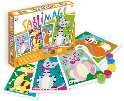 Sablimage Zandtekeningen Set Troeteldiertjes kunnen kinderen kleurrijke en schattige zandkunstwerken maken van hun favoriete huisdieren. De zelfklevende sjablonen maken het eenvoudig om het gekleurde zand precies op de juiste plek te strooien, zonder lijm te gebruiken. Laag voor laag ontstaan zo levendige en vrolijke afbeeldingen die kinderen met trots kunnen tentoonstellen. Deze creatieve activiteit bevordert concentratie, fijne motoriek en verbeeldingskracht.
