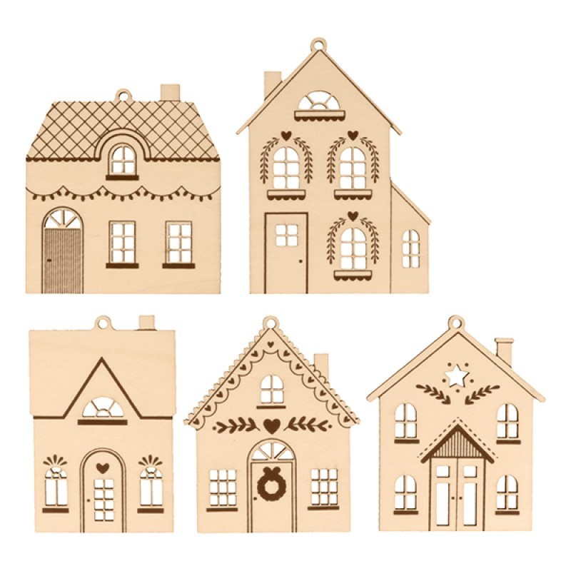 De set Huizen van Artemio bevat 5 houten silhouetten van 5 tot 7,5 cm lang en 8 tot 10 hoog. Het silhouet is 2 mm dik.