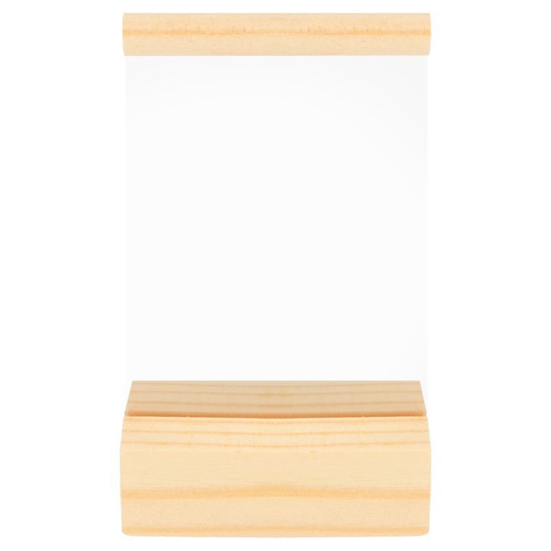 Hij bestaat uit 2 te versieren plexiglasplaatjes van 5,5 x 8,5 x 1,3 cm, een gegroefd houten plaatje van 6 x 2 x 2,5 cm en een houten topje van 6 x 0,8 cm.
