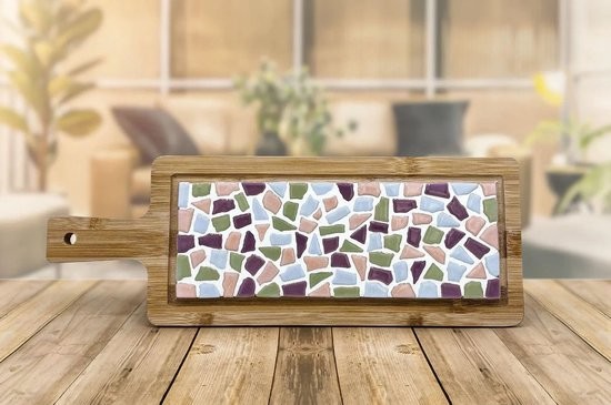Een leuk DIY projectje! Een zelfgemaakte borrelplank die een echte aanvulling voor elk interieur is! Je kunt namelijk kiezen uit vijf verschillende kleuren. De borrelplank is van hoogwaardig bamboehout (40 cm lang) en zeer geschikt voor het serveren van een hapje bij de borrel, een koekje bij de koffie of een broodje bij de soep. De plank beleg je met mozaïek steentjes in een zelf te kiezen kleurvariatie.