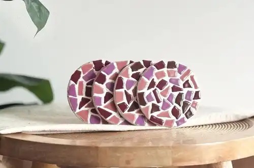 De houten onderzetters hebben een diameter van 9 cm en zijn ideaal voor kopjes, glazen of kleine kommetjes. Dankzij de mozaïekafwerking krijgen ze een stijlvolle, persoonlijke uitstraling die past bij jouw interieur.