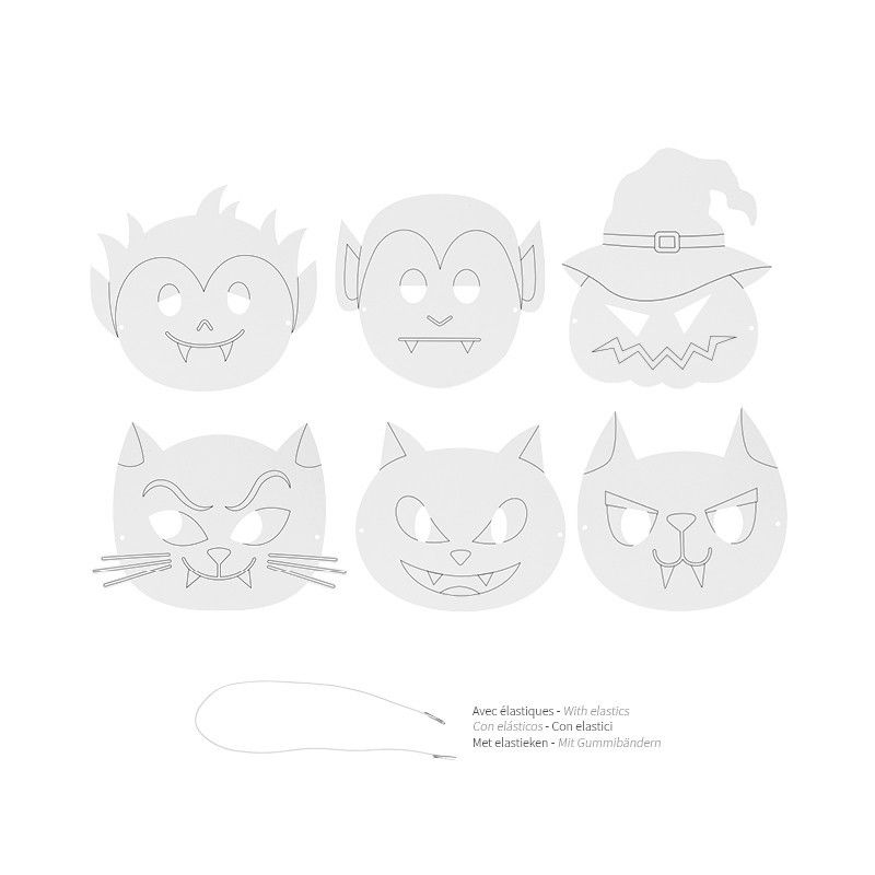 De set bevat 6 witte Halloween-maskers van karton om te versieren, geleverd met 6 elastiekjes.