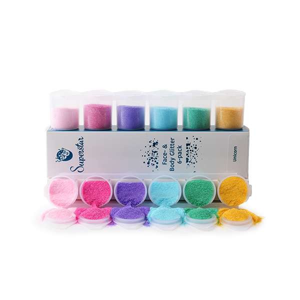 Sixpack met Superstar Glitters met 6 verschillende kleuren glitters in mooie diepe kleuren en bevat ongeveer 6 x 15 ml