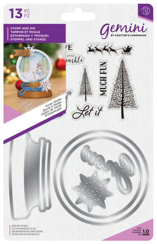 Gemini combinatie set voor het maken van een prachtige Shaker Card (Schudkaart). Snijd de vormen uit. Gebruik 3D foam om een hoogteverschil te creëren. Mt transparant acetate dekt u de vorm af. Decoreer met de bijgeleverde stempeltjes