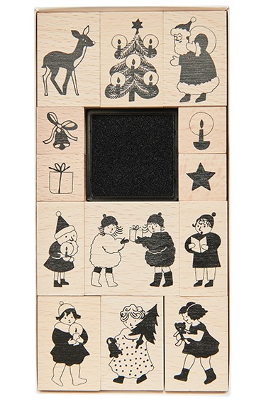 Informatie over stempelset - Kerstkinderen, 13 houten stempels + stempelkussen