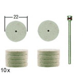 Viltpolijstmachines, voor het voorbereidend en glanzend polijsten van metalen, goud, zilver, messing en aluminium. Ook geschikt voor het afwerken van mallen en gereedschappen. Asdiameter: 2,35 mm. Bij het polijsten is het raadzaam om met een laag toerental te werken om te voorkomen dat het werkstuk en het accessoire verbranden. Maak de polijstpasta zacht met olie of verwarm deze lichtjes. Alle afmetingen zijn in mm.