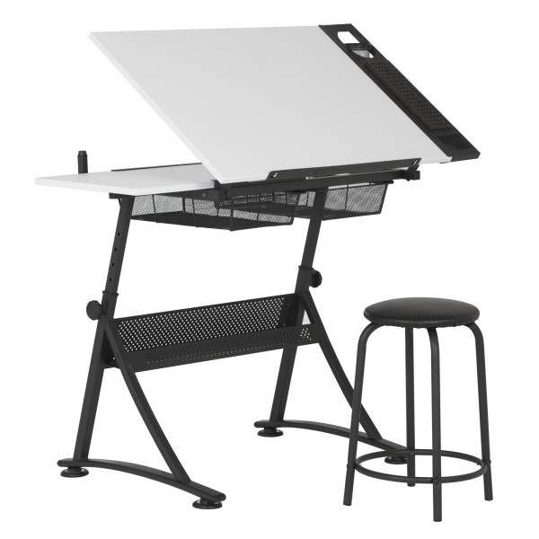 Ten slotte is er een onderste opbergvak tussen de poten dat 74 cm. breed en 12,7 cm diep is, voor Verfpotten , spuitbussen en dergelijke hoge materialen. U kunt de hoogte van het bureaublad aanpassen met stappen van 3,8 cm van 70,5 tot 90 cm. Een 53,3 cm hoog gevoerde kruk met metalen poten met poedercoating maakt deze set compleet.