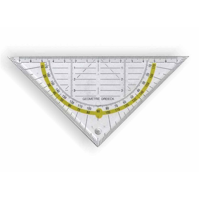 Een geodriehoek is een meetinstrument, vaak van doorzichtig plastic, dat wordt gebruikt voor het meten en tekenen van hoeken en rechte lijnen. Het heeft een driehoekige vorm met een rechte hoek en twee schuine zijden, vaak gemarkeerd met gradenverdelingen voor nauwkeurige hoekmetingen. Het beschikt meestal ook over een liniaal langs de rechte zijden voor het meten van lengtes. Deze tool is essentieel voor wiskundige en technische tekeningen, evenals voor het uitvoeren van geometrische berekeningen.