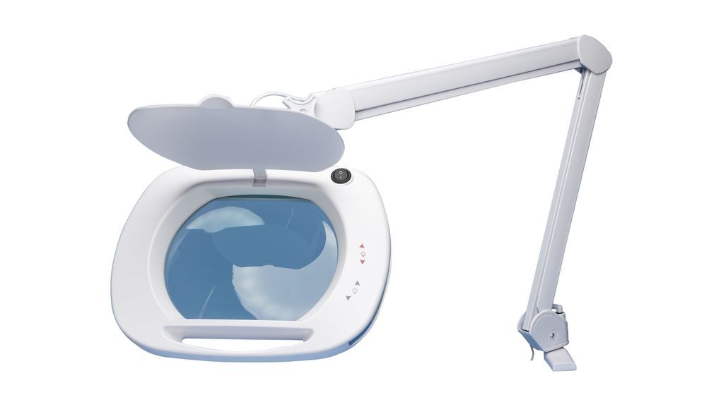 Dimbare licht met vergrootglas. Het 60 LED-lampen kunnen niet enkel gedimd worden, maar tevens ook ingesteld worden qua kleur: een geel licht (3200-3400K), een neutraal licht (3500-4100K) of een koud licht (5000-5400K), afhankelijk van de toepassing of de wenst van de gebruiker.