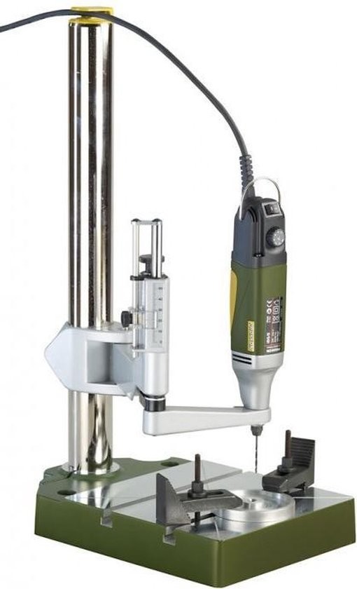 Met dubbelscharnierende boorarmen 20 mm systeempassing. Het gemonteerde apparaat kan in 1 beweging zowe een verticale als horizontale bewerking uitvoeren. Hij blijft daarbij altijd loodrecht gepositioneerd. Zo kunnen bijvoorbeeld boorgaten loodrecht over het werkstuk worden uitgevoerd. Vast instelbare boordiepte dmv diepteaanslg met duidelijk afleesbare diepte-instelling. Een instelbare veer plaatst het apparaat na de bewerking automatisch in de bovenste uitgangspositievlak gefreesde massieve grondplaat met 200mm x 200 mm bruikbaar werkvlak en twee doorlopende T-gleuven. Stabiele boorkolom met diameter van 45mm en 500mm lang. 200mm systeempassing voor het nauwkeurig plaatsen van boormachines. Zoals fijnboorslijper FBS240/E, industrieboorslijper IB/E, langhals boorslijper LB/E, MICROMOT 50, 50/E en 5/EF.