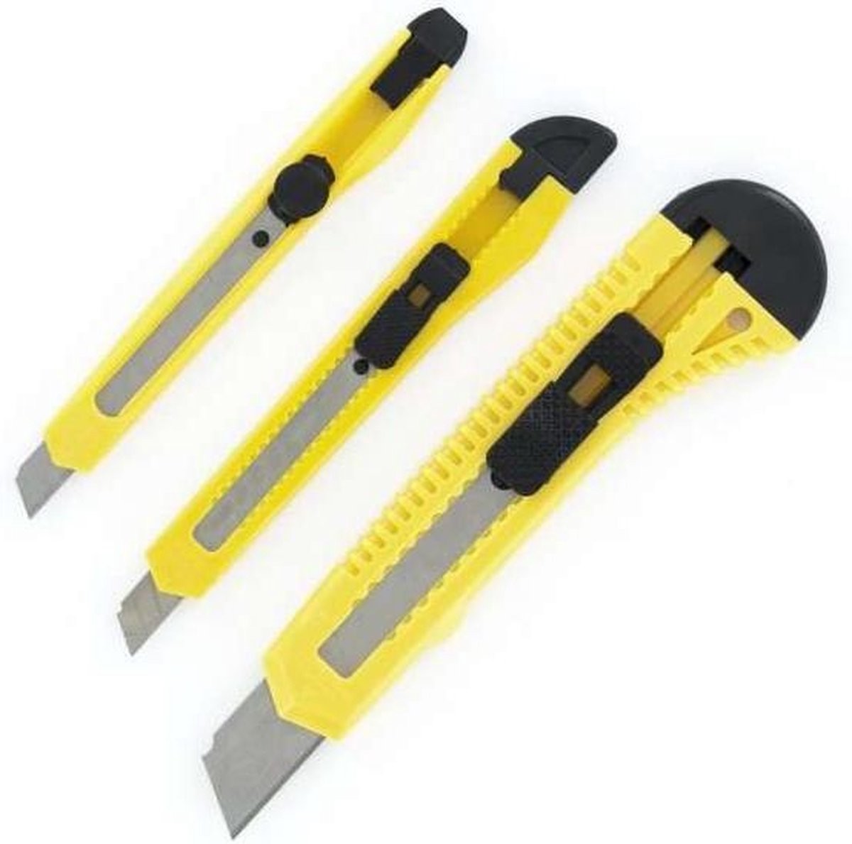 Modelcraft Razor Knife Set 3 pieces • 3 verschillende maten • Messen kunnen eraf worden geklikt • Sluitsysteem Modelcraft 3-delige scheermessenset Deze scheermessen zijn er in 3 verschillende maten (small, medium & large) en zijn voorzien van een vergrendelingssysteem. De stalen messen kunnen indien nodig eenvoudig worden afgebroken om de volgende scherpe rand in de rij bloot te leggen. Voor modelbouw, hobby & kleine doe-het-zelf taken. Messen & Snijders De Modelcraft-collectie omvat gespecialiseerde messen en snijders die geschikt zijn voor een breed scala aan toepassingen, waaronder snijden, snijden, zagen, gutsen, etsen, doorboren, inkerven, schrapen, aftekenen en trimmen. Van eenvoudige sneden in papier of karton tot het aftekenen en trimmen van gelamineerd plastic en acryl, Model Craft heeft het juiste gereedschap voor de klus.