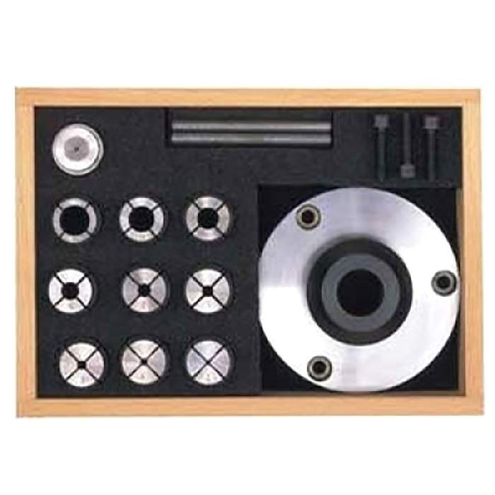 Voor zeer nauwkeurig werken aan ronde werkstukken. 9 geharde spantangen (elk 1 stuk in 2 - 3 - 4 - 5 - 6 - 8 - 10 - 12 en 14 mm). Voor een rondloop van 0,02 mm, dus nauwkeuriger dan met een spantang. Wordt geleverd met 1 niet-geharde spantang. Op de plaats van de spankop moet de spaninrichting worden gemonteerd. Geleverd in een houten kist.