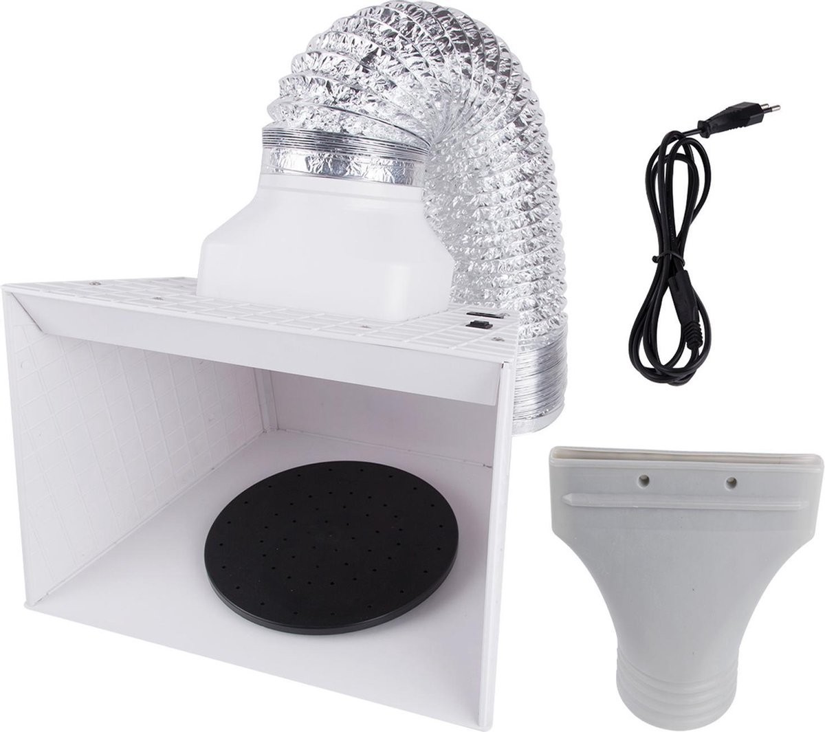 Perfect voor kleine voorwerpen van keramiek tot modellen met radiobesturing. Inclusief een draaibaar draaiplateau waarmee u gemakkelijk alle te schilderen gebieden kunt bereiken. Uitgerust met 220 Volt ventilator, 25W. Maakt gebruik van een glasvezelfiltersysteem. Booth is bedoeld om grotere deeltjes uit de lucht te verwijderen.