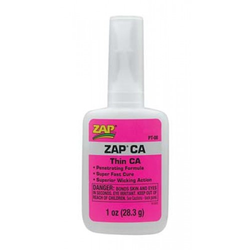 ZAP CA is een zeer dunne en snel drogende secondenlijm, geschikt voor praktisch elk materiaal, zelfs balsa en andere zachte houtsoorten. ZAP CA Thin Werkt het beste op: aluminium, metalen, kunststoffen, aardewerk, rubber en hout. De lijm droogt in 1 tot 5 seconden.