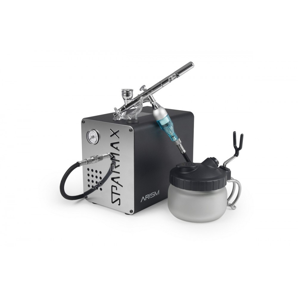 bevat Compressor AC-66HX (ARISM), Airbrush SP-35 met slang, Reinigingspot SCP-700 en Silver Bullet