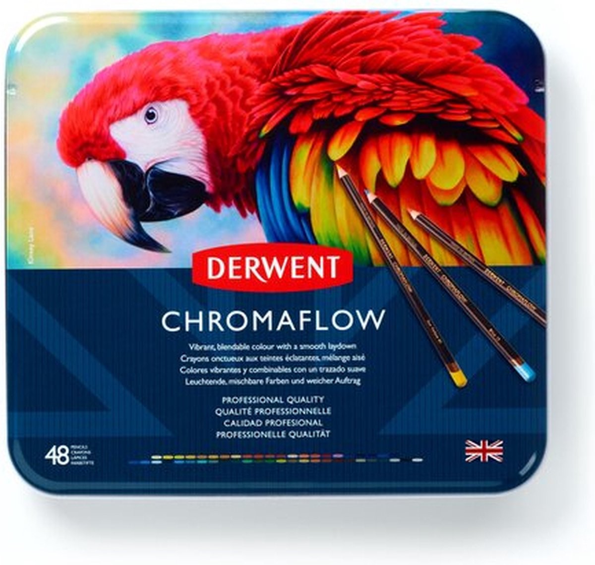 48 slanklijnige kleurpotloden van kunstenaarskwaliteit, geformuleerd met hoogwaardige pigmenten, voor opvallende levendigheid die opvalt, zelfs op donker papier. De zachte kern van Derwent Chromaflow-potloden zorgt voor een fluweelzachte, snelle lay-down, die de pagina bedekt met levendige kleuren.