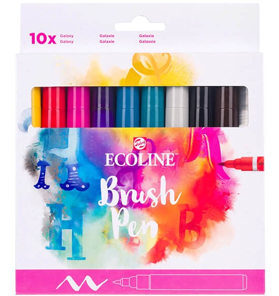 Deze set bevat 10 Ecoline Brush Pens in verschillende levendige tinten. De Brush Pen kenmerkt zich door de flexibele punt en het uitgebreide assortiment schitterende kleuren dankzij de pure formule op kleurstofbasis. De transparante kleuren bieden de beste resultaten bij gebruik op wit of zeer lichtgekleurd papier. Indien gewenst kun je de kleurintensiteit gemakkelijk verminderen door ze te verdunnen met water of met de Brush Pen blender. Deze pennen zijn perfect voor handlettering, aquareltekeningen, snelle schetsen en finishing touches.