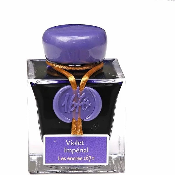 Inkt 1670, Violet Impérial, met blauwachtige reflecties en duizend glinsteringen, voor een onvergelijkbare schrijfervaring. Flesje 50ml. Vanwege zijn zeldzaamheid werd deze inkt, symbool van luxe maar ook van mysterie, in het Romeinse Rijk gebruikt door de keizer en zijn afhankelijken en later door de verschillende koningshuizen. Ook koning Lodewijk XIV, onder wiens bewind het Huis Jacques HERBIN werd opgericht, gebruikte het in bepaalde fasen van zijn leven voor zijn kleding.