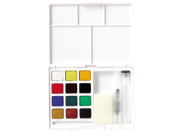 De Koi Water Colors Sketch Box Creative Art Colors bevat 12 halve napjes met een assortiment van levendige waterverfkleuren, ideaal voor diverse creatieve projecten. De kleuren in deze set zijn Cadmium Red, Vermillion, Cadmium Yellow, Lemon Yellow, Green, Sap Green, Cerulean Blue, Ultramarine Blue, Cobalt Blue, Brown, Black en White. Elke kleur biedt helderheid en mengbaarheid, waardoor je een breed scala aan tinten en effecten kunt bereiken. De set komt in een praktische doos met een geïntegreerd palet, ideaal voor zowel beginners als ervaren kunstenaars.