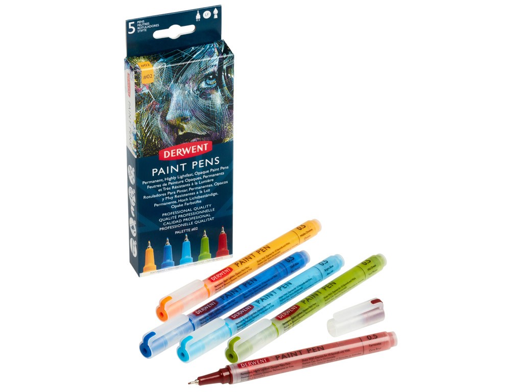 Derwent Paint Pens zijn een creatief teken- en schildergereedschap dat gepigmenteerde acrylverf bevat die zeer lichtbestendig en permanent is zodra deze droog is. De hoogwaardige, breukbestendige 0,5 mm Japanse pennen zijn zeer duurzaam en zorgen voor een verscheidenheid aan unieke verfeffecten, van fijne lijnen tot grote lagen en opwindende, fantasierijke verfspatten.