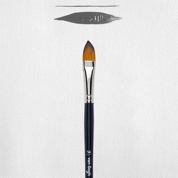 Dit met zorg gemaakte en met de hand gevormde penseel voor olie- en acrylverf heeft een flexibele haarbundel die bestand is tegen slijtage. Door de flexibiliteit van de gouden synthetische haarbundel is dit penseel bijzonder geschikt voor acrylverf, aangezien acrylverf normaal gesproken in een vloeibaarder consistentie wordt gebruikt. Dit penseel met de vorm van een kattentong (filbert) heeft een fijne punt voor het toevoegen van fijnere details en scherpe accenten. De breedte van de haarbundel op dit penseel is 11,7 mm