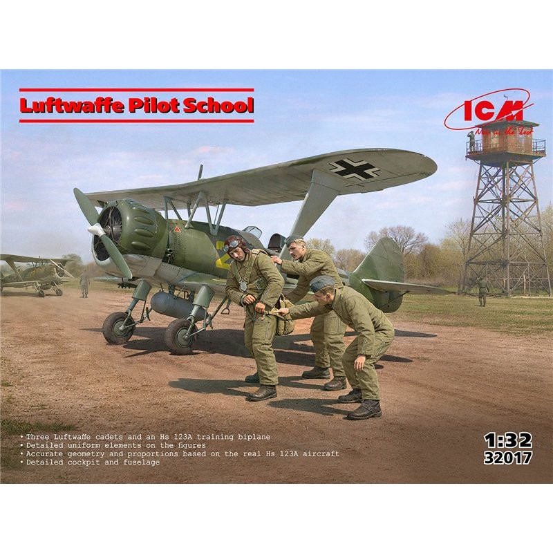 ICM 1/32 Luftwaffe Pilot School - Henschel Hs-123A (late) with Crew is a plastic model of German WWII biplane attack aircraft. The kit includes crew figures and is aimed at training use of this type in Luftwaffe pilot schools. The 1:32 scale offers a very good level of detail and allows for an impressive model suitable as the basis for a training-themed diorama. The package does not include the paints or glues needed for assembly