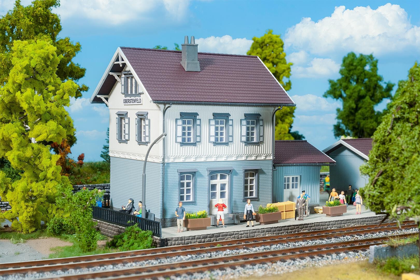 De trein rolt langzaam het spoor op en de passagiers op het perron maken zich klaar voor vertrek. Het station met zijn lichtblauwe en witte houten gevel, gemodelleerd naar het oorspronkelijke station van Oberstenfeld, is een echte blikvanger op de modelbaan. Oberstenfeld ligt aan de Bottwartalspoorlijn tussen Marbach en Heilbronn. Na de sluiting van de spoorlijn werd het station gerestaureerd en doet het nu dienst als ontmoetingsplaats voor de plaatselijke gemeenschap. Het belichaamt de charme van een typisch station in een kleine stad, vol liefdevolle details die het een speciaal karakter geven.