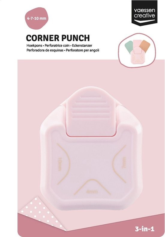Met deze Vaessen Creative hoekpons - in het Engels corner punch of corner rounder genoemd - kun je drie maten hoeken ponsen met één pons. Pons een kleine hoek van 4 mm, een middelgrote hoek van 7 mm of een grote hoek van 10 mm simpelweg door de pons een kwartslag te draaien. Dankzij de drie verschillende maten van deze hoekpons biedt één pons veel mogelijkheden voor gebruik met papier, karton, foto’s en meer.