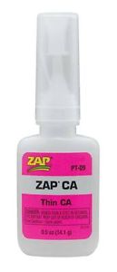 ZAP CA is een zeer dunne en snel drogende secondenlijm, geschikt voor praktisch elk materiaal, zelfs balsa en andere zachte houtsoorten. ZAP CA Thin Werkt het beste op: aluminium, metalen, kunststoffen, aardewerk, rubber en hout. De lijm droogt in 1 tot 5 seconden.