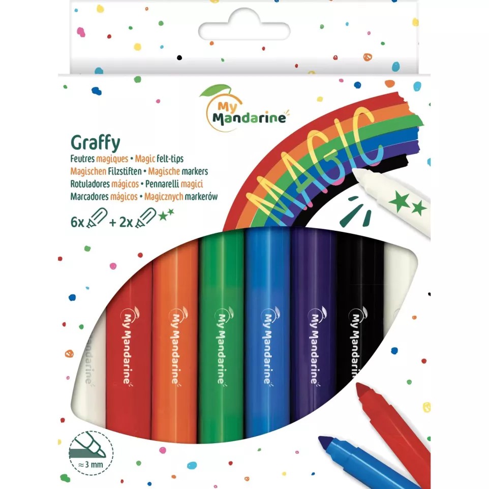 Zakformaat set van 8 magische stiften (6 kleuren + 2). Deze magische stiften veranderen van kleur zodra je de speciale pen gebruikt. Elke streep is een verrassing, waardoor kleuren leuker wordt en de fantasie en de drang om steeds opnieuw te creëren worden gestimuleerd. Kinderen kunnen kleuren mengen, unieke effecten creëren en nieuwe ideeën uitproberen. Het is een ideale activiteit om vrij te tekenen en de creativiteit te ontwikkelen terwijl ze plezier hebben. Kleuren met magische stiften bevordert de hand-oogcoördinatie, de fijne motoriek en de concentratie. Een educatieve activiteit geschikt voor kinderen. Deze stiften zijn ontworpen voor kleine handjes en bieden een goede grip en soepele inkt. De magische effecten zijn gemakkelijk te bereiken, voor een bevredigend resultaat zonder frustratie. Perfect om kinderen thuis of onderweg bezig te houden. Deze magische stiften bieden een rustig en creatief moment, weg van schermen, alleen of met het gezin.