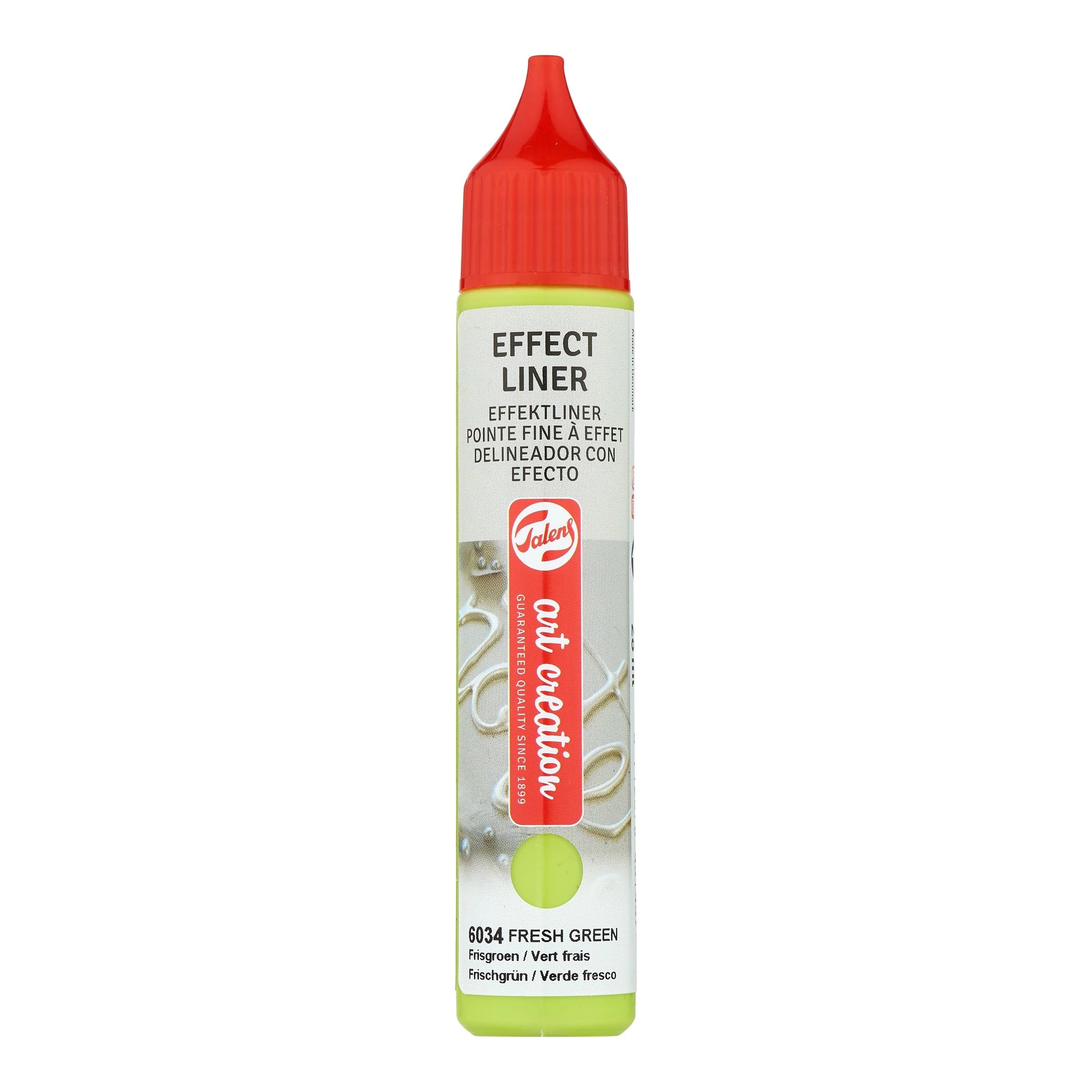 Een reliëfliner voor het creëren van driedimensionale lijnen en stippen op vrijwel elk lichtabsorberend oppervlak, waaronder de meeste textielsoorten. De Effect Liners zijn zeer geschikt voor het aanbrengen van fraaie gladde 'parels'. Houd voor een optimaal 3D-effect de punt net boven het oppervlak en druk de verf er in een vloeiende beweging uit. Droog tijd: 24 uur. Alleen voor gebruik binnenshuis. Bij het aanbrengen op textiel: was de stof zonder wasverzachter voordat je de verf aanbrengt. Wasbaar op 40 °C. Beschikbaar in 49 verschillende tinten en diverse effecten, zoals parelmoer, glans, glitter en neon.