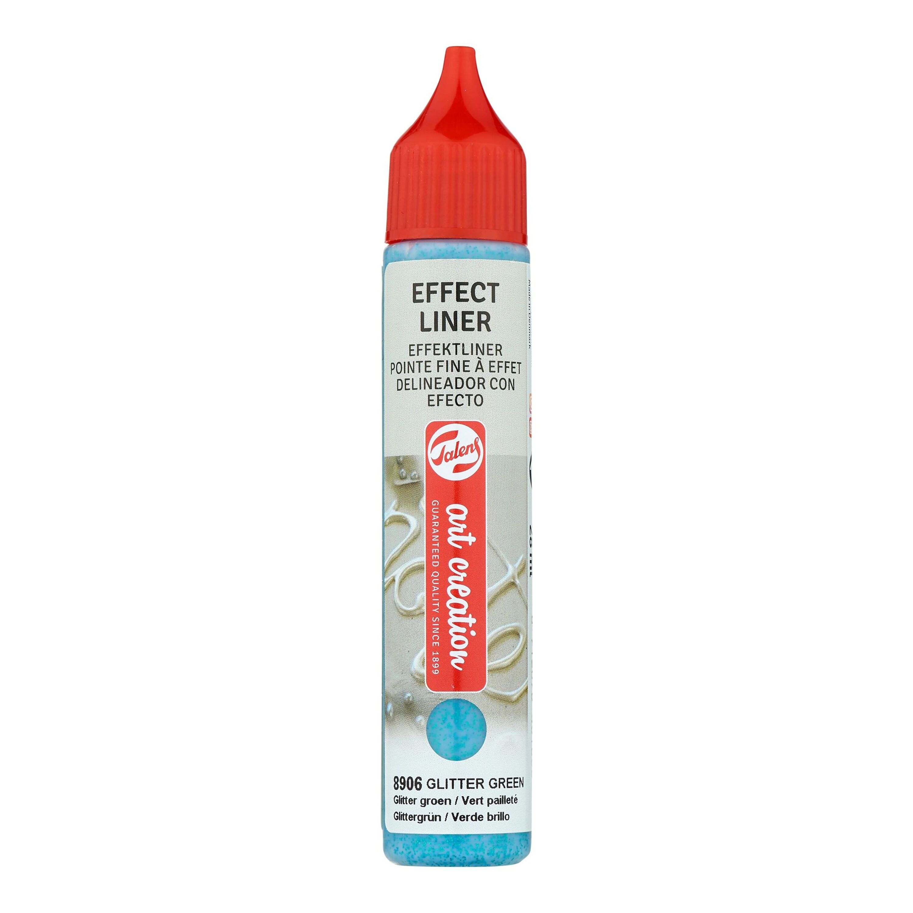Een reliëfliner voor het creëren van driedimensionale lijnen en stippen op vrijwel elk lichtabsorberend oppervlak, waaronder de meeste textielsoorten. De Effect Liners zijn zeer geschikt voor het aanbrengen van fraaie gladde 'parels'. Houd voor een optimaal 3D-effect de punt net boven het oppervlak en druk de verf er in een vloeiende beweging uit. Droog tijd: 24 uur. Alleen voor gebruik binnenshuis. Bij het aanbrengen op textiel: was de stof zonder wasverzachter voordat je de verf aanbrengt. Wasbaar op 40 °C. Beschikbaar in 49 verschillende tinten en diverse effecten, zoals parelmoer, glans, glitter en neon.