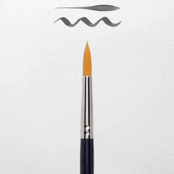 Dit met zorg gemaakte en met de hand gevormde penseel voor aquarelverf heeft een flexibele haarbundel die bestand is tegen slijtage. De gouden synthetische haarbundel kan een grote hoeveelheid water opnemen en heeft een ronde vorm met een zeer fijne punt voor precisiewerk. De breedte van de haarbundel op dit penseel is 6,6 mm