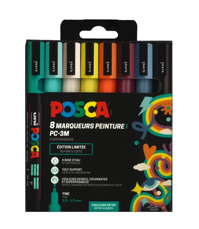 Deze set van 8 Posca markers (PC3M) bevat retrokleuren: zwart, leigrijs, smaragdgroen, watergroen, beige, geel, donkeroranje en wijnrood. Met een fijne punt van 0,9 – 1,3 mm zijn ze permanent op hout, textiel en karton, uitwisbaar van glas en vereisen fixatie op metaal, plastic en keramiek. De markers zijn dekkend, ondoorzichtig, mat en op waterbasis.