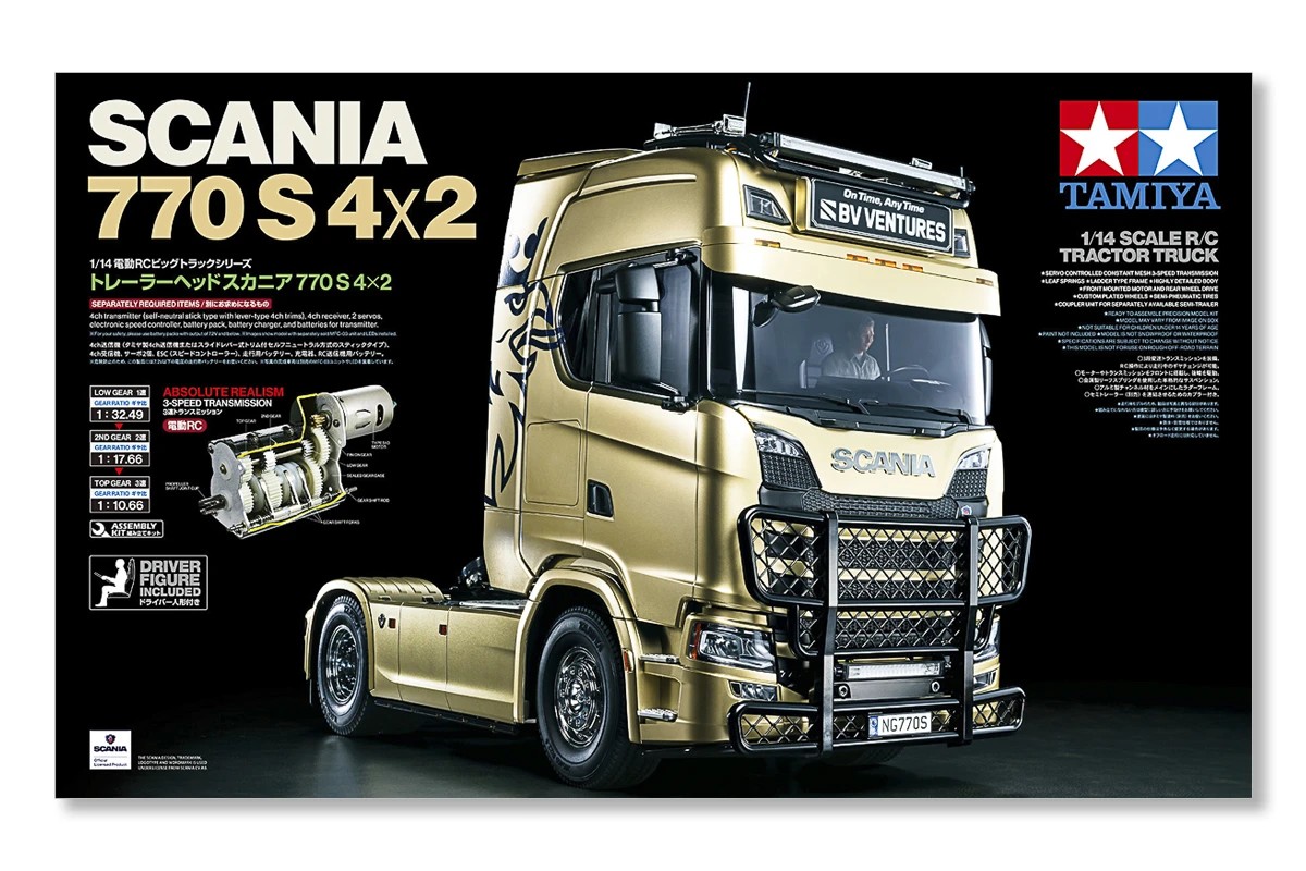 Na artikel 56368 (1/14 R/C Scania 770S 6x4) en artikel 56371 (1/14 R/C Scania 770S 8x4/4) presenteert Tamiya de Scania 770 S 4x2 tot en met 1/14 Tractor Truck Series.