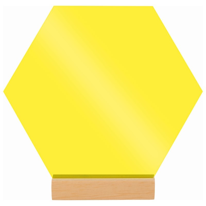De gele zeshoek meet 17x15 cm en is 3 mm dik. De houten sokkel meet 10x2 cm en is 2 cm ...